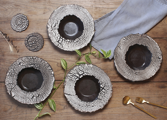 Elle réalise également des collections d'assiettes, coupes, mugs pour les restaurants gastronomiques sur commande.